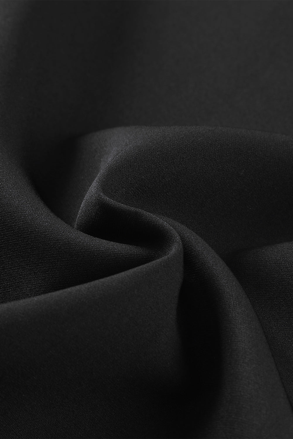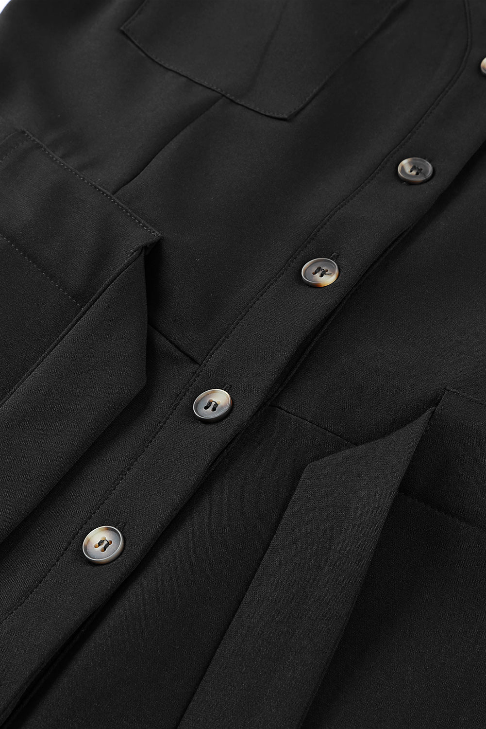 Black button front jumpsuit with a sleeveless design and tie waist, offering a relaxed, subtly defined silhouette. A timeless one-piece.